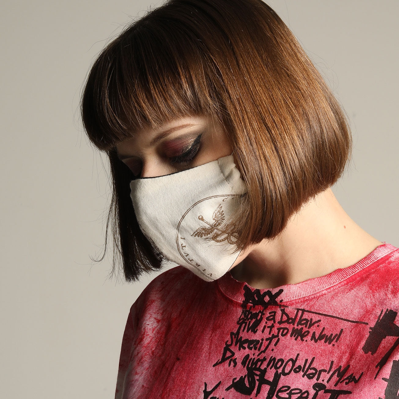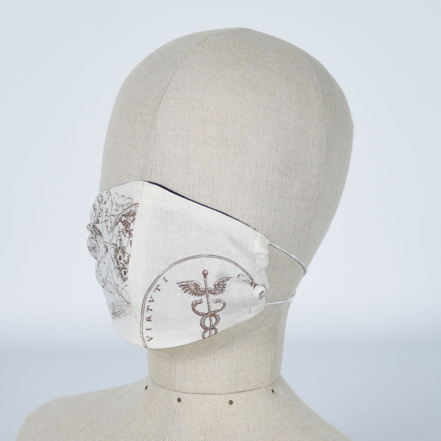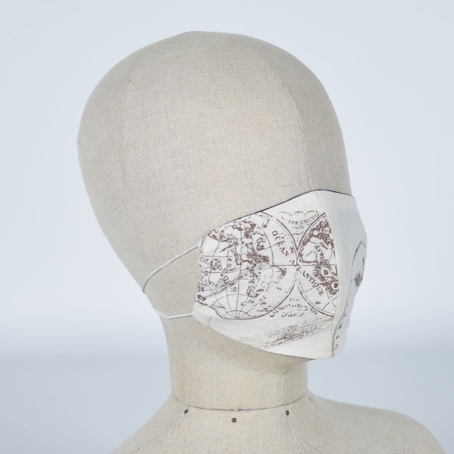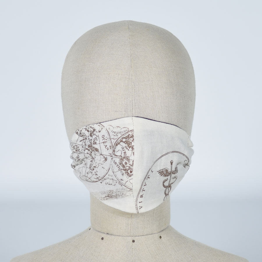 A steam punk world maskwear with an antique world map printed on a textured gauze.