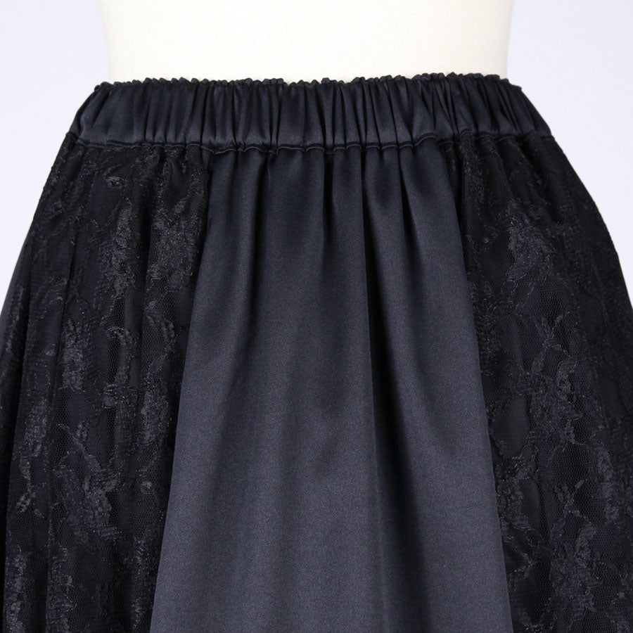 An elegant flared long skirt that combines different materials such as lace and matte satin.。