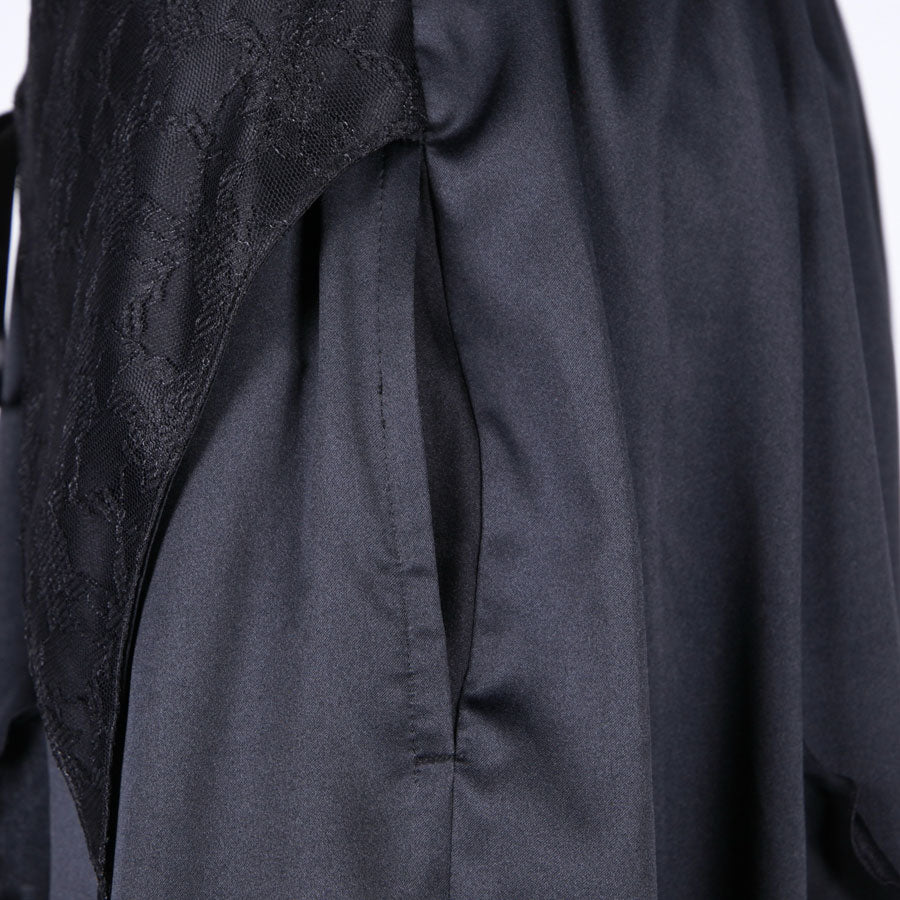 The combination of delicate lace and matte satin creates an elegant and dramatic impression.