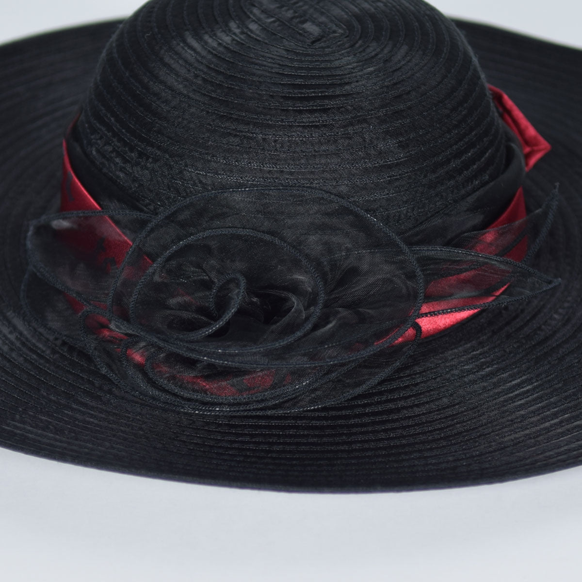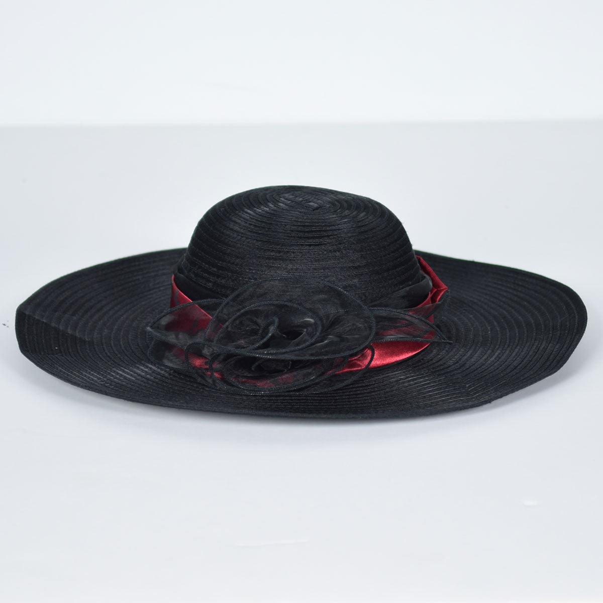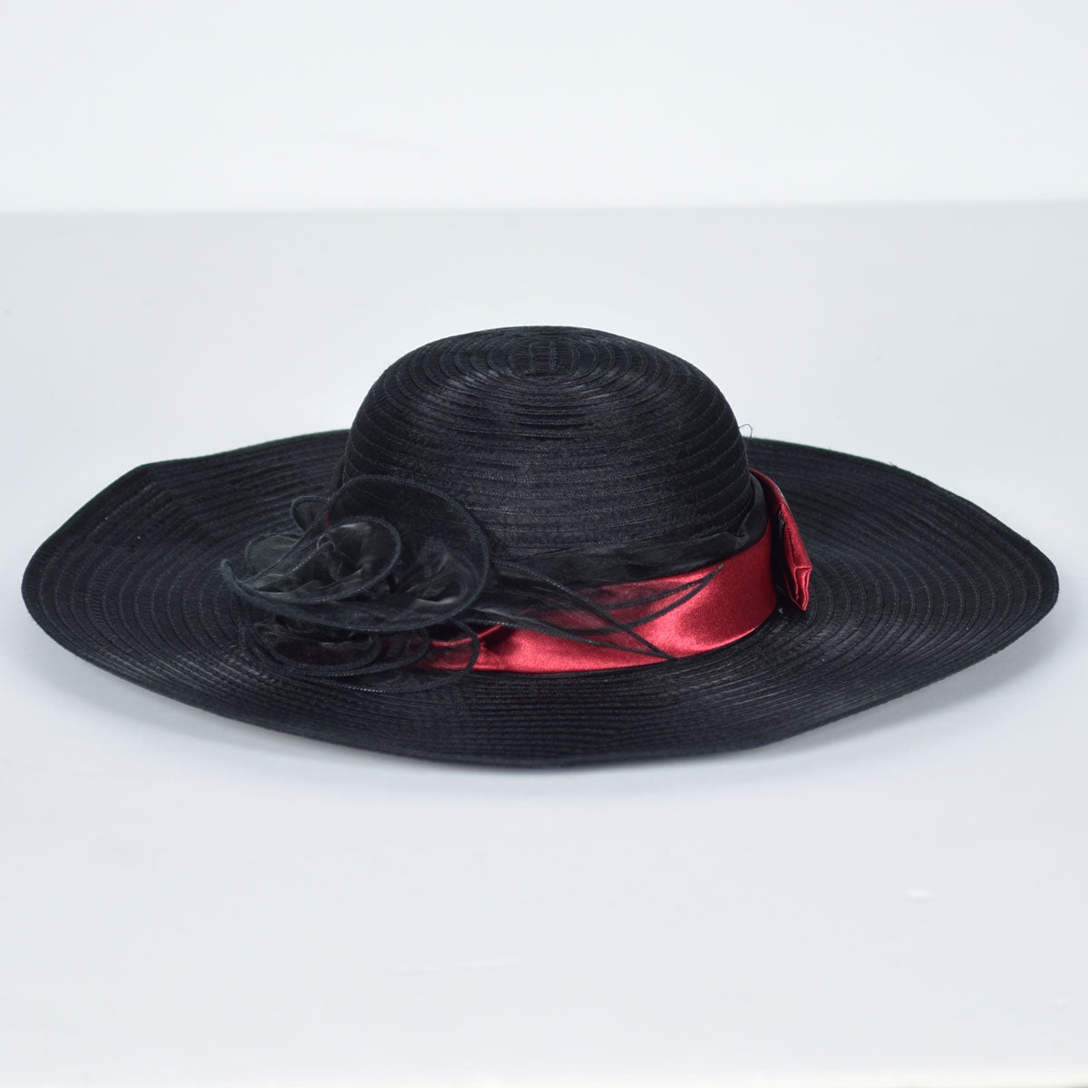 ツバの長さと装飾を最大限に活かし、鮮烈なレッドリボンをポイントにしたドレスハット。
