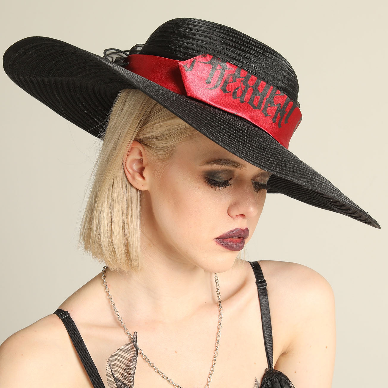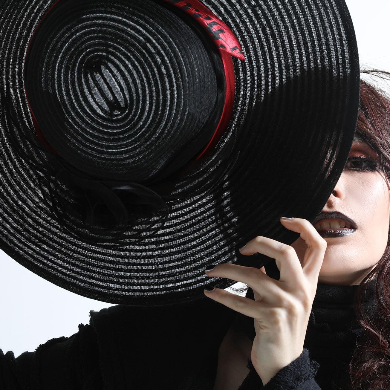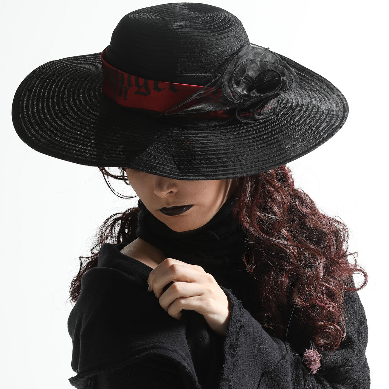 真っ赤なリボンが目立つゴシック調のツバ広ハット。