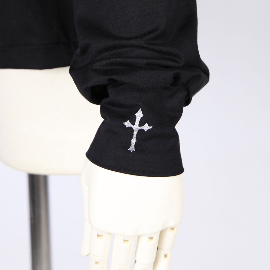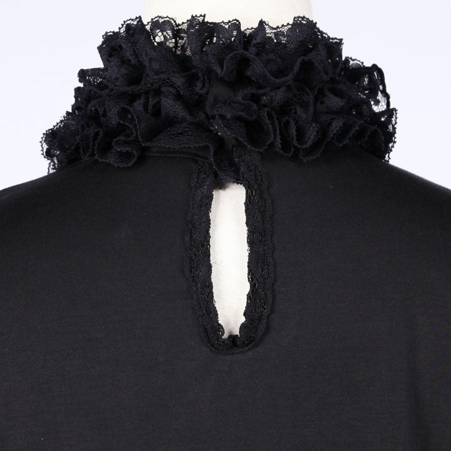 ハイネック部分にたっぷりのレースフリルを重ね、ゴシックコーディネートのインナーとして存在感を発揮します。