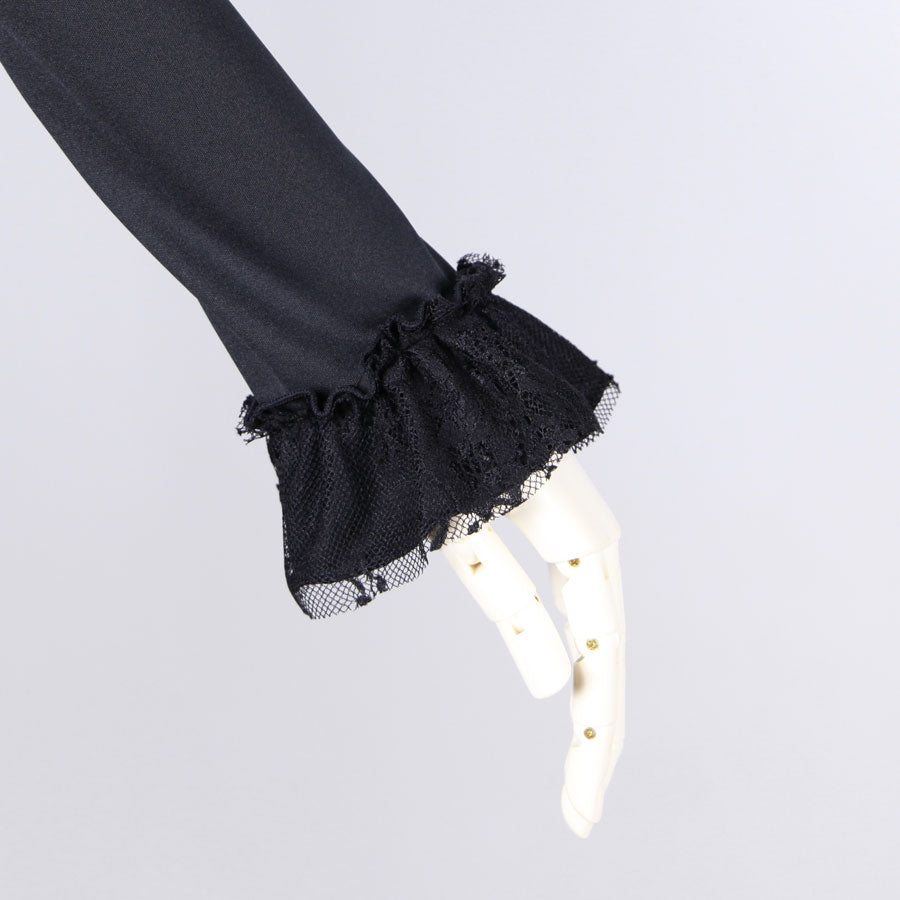 艶やかなストレッチカットソー素材をベースに、首回りと袖口に繊細なレースラッフルをあしらい、大人の甘さをプラス。