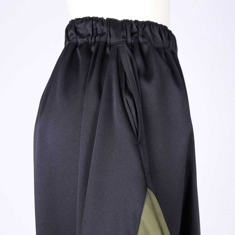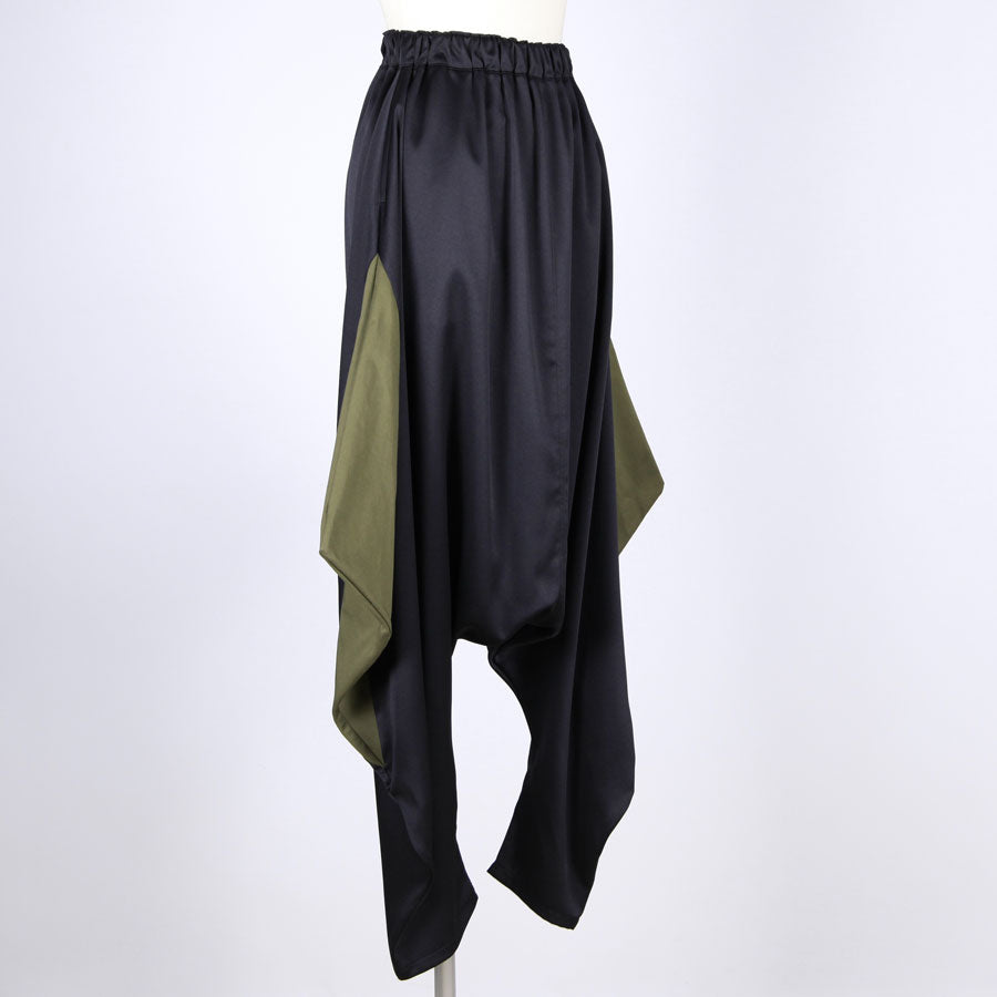 スカートのように広がる膝部分とオブシディアンカラーのサルエルパンツ。